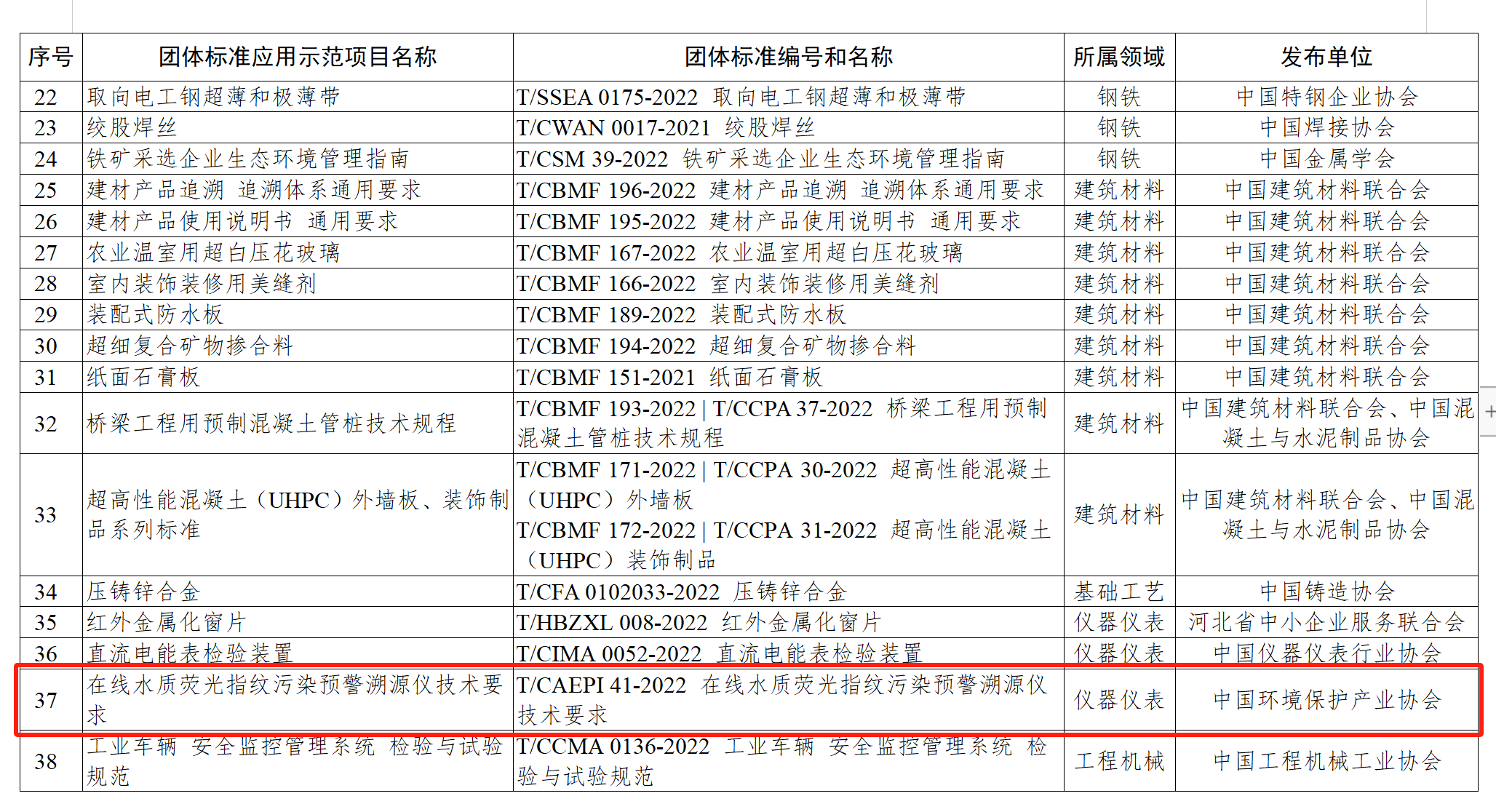 近日,由清華大學(xué)和中國環(huán)境監(jiān)測總站牽頭,我司參與編寫,由中國環(huán)保產(chǎn)業(yè)協(xié)會發(fā)布的團體標(biāo)準(zhǔn)《在線水質(zhì)熒光指紋污染預(yù)警溯源儀技術(shù)要求》(T/CAEPI 41-2022 ),按照相關(guān)要求經(jīng)過申請、推薦、技術(shù)初審和專家評審等環(huán)節(jié),作為唯一一項環(huán)保儀器標(biāo)準(zhǔn)入選工信部2023年百項團體標(biāo)準(zhǔn)應(yīng)用示范項目。